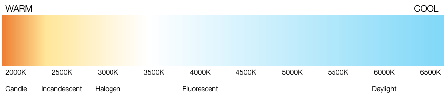 Color temperature is measured in degrees Kelvin. Why that is true is a consequence of the physics of light that doesn’t much matter for this discussion. One thing that is very confusing though: “warm” light – yellowish white, say 2500K to 4000K has a lower color temperature than “cool”, bluish white light, say 5000K – 6500K. Yup, “warm” is cooler, “cool” is hotter. Weird, huh?