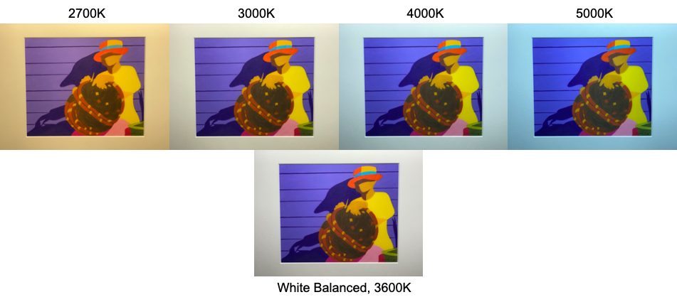 Here is a piece of art photographed at different color temperatures. This is what the camera actually sees – but the color shifts look exaggerated here because cameras do not possess our vision’s color constancy! That’s why cameras have manual white balance adjustments or sophisticated AI to compensate. Your eye will see something close to the white balanced image under any of these color temperature sources, but with a slight cast towards warm or cool, and a different “mood” – relaxed or energized – depending on the relative warmth or coolness of the source.